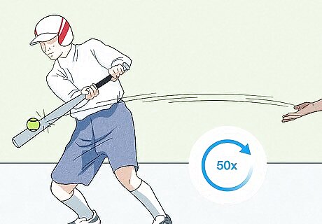 Hit 50 short lobs. Have someone lob pitches from a short distance, and aim to take about 50 swings this way. Hitting a short lob will require a slightly faster speed and harder contact, continuing the gradual process of breaking in the bat. Short lobs are often used to help batters work on their form. Work with your coach or a friend to swing 50 times this way. If no one is available to pitch short lobs, you can use a pitching machine. Adjust it to pitch slowly and without an arch so you don't have to change your form to make contact. Hitting reps are a great way to break in your bat.