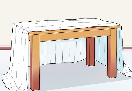 Drape a blanket over a 4-legged table. A quick and easy way to make a fort is to use a table as your base. Pull the chairs away from a 4-legged table and drape a large blanket over it, and voila! Your fort is complete! If you need to, hang a blanket over the sides of the table and place a heavy object on top to keep them in place. Make sure to choose a table that is high enough for you to fit underneath. Use a blanket that is large enough to cover all 4 sides of the table.