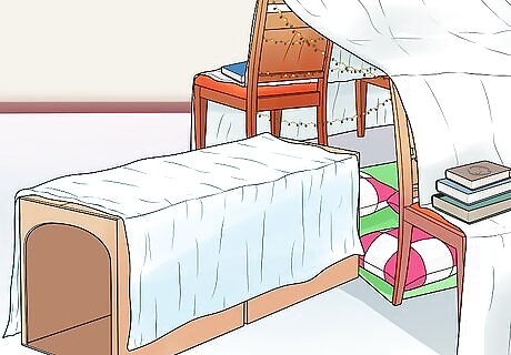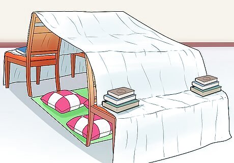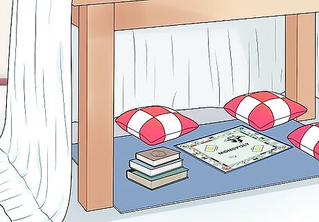 Place blankets and pillows on the floor of the fort to make it comfortable. Fold a comforter or other fluffy blanket in half and lay it down, or layer a few blankets to add cushioning to the bottom of the fort. Then, place several cushions or pillows around the edges of the fort. Also place extra blankets or sleeping bags in the fort to cover yourself up. If the ceiling of your fort is high enough, place a few low chairs or stools in the fort for sitting, such as bean bag chairs or ottomans.