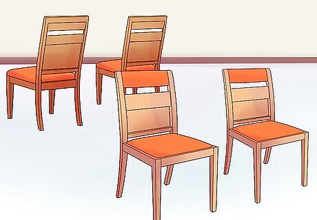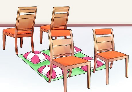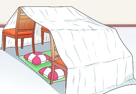 Set up 2 rows of chairs with the backs facing each other. Chairs are a great option since their backs provide a high ceiling for a fort, giving you plenty of room inside. Position the rows of chairs in front of a sofa, bed, or a wall if you want the fort to have a back wall. Space the rows of chairs about 4 to 6 ft (1.2 to 1.8 m) apart, but adjust them depending on the size of your blanket. If you don’t have chairs to support your fort, look for other sturdy, tall items nearby. Laundry hampers, bunk beds, ottomans, and heavy boxes are prime fort-building materials, so long as they won’t easily fall overTip: Your blanket fort will need to have enough room for you to crawl and play in, so choose an area with plenty of space and avoid blocking doorways. The living room, dining room, or bedroom are all good options.
