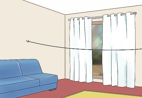 Extend a clothesline across the room for an extra-large fort. If you want a large, long fort, then string a clothesline from 1 end of your living room or bedroom to the other. Tie the line to wall hooks or sturdy, tall furniture. Then, drape blankets and use smaller pieces of furniture to keep the blankets from caving in. This will allow you to create a fort that can span the entire length of a room. If you need more stability, simply tie on more strings! For a wider fort, set up 2 clotheslines running parallel to each other and hang the blankets over both of them. Drape a sheet from an outdoor clothesline to make a quick and easy outdoor fort.