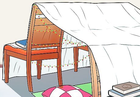 Add lights to the fort to let you see when you’re inside. If you want to read inside your fort, or play board games with siblings or friends, you’ll need to add some lights. Christmas or string lights look great, and they come in all sorts of colors. String the lights across the ceiling of the fort, or place them on the ground around the edges of the fort. Also place a few flameless candles or a battery-powered lantern inside of the fort. A flashlight works, too! Use it to light up your face while telling a spooky story. Make sure your lights don’t burn too hot, which could be a fire hazard.
