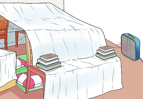 Place a fan at the end of the opening to keep the space cool. Forts can get pretty hot, especially after a busy day of adventuring. Place a fan in front of the opening to the fort to help circulate air throughout it. Avoid hanging any blankets behind the fan—they may get stuck in it and break it. Using a fan is also a great way to make an inflatable fan fort.