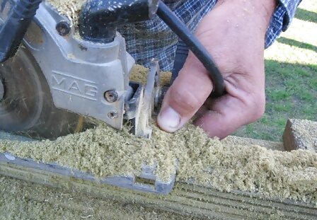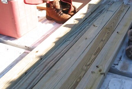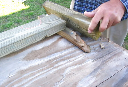 Set blocks on the table to support the boards. Next, attach a stop for keeping them from sliding while you rip them to width. If you have a table saw, you can use this for ripping the slats instead.