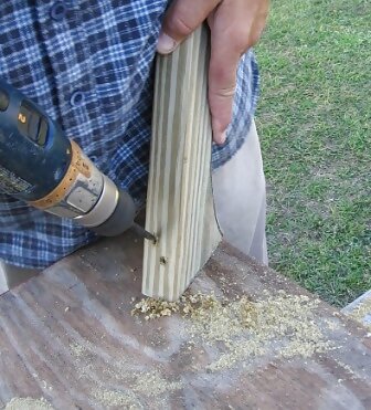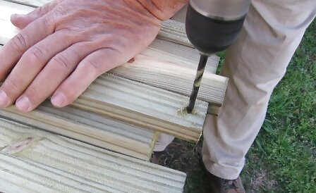 Drill through each slat, 1 in. (25.4 mm) from both ends, with a 3/16 in. (4.76 mm) drill bit. Later, when you attach the slats to the frame with wood screws, these pre-drilled holes will keep the slats from splitting. You may also want to drill a hole in the dead center of each slat depending on whether or not you think your bench needs a center support. If you’re making a short bench and/or working with hardwood, a center support may not be necessary. If in doubt, however, include one. The bench in this tutorial has a center support.