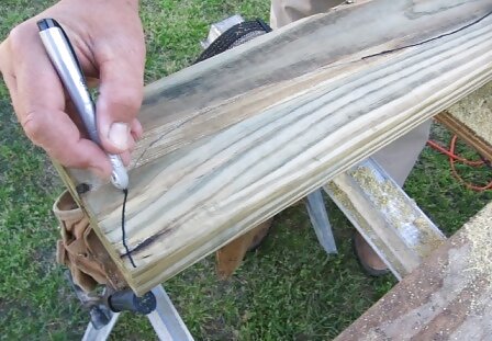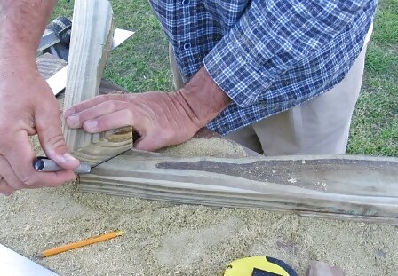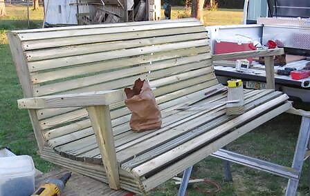Cut a miter at the ends of the back and the seat board. This is so the back and seat boards join at the correct angle for the amount of slant (recline) you want your seat to have. You can start by cutting a 45-degree angle into one of the two pieces, then laying it on top of the opposite piece and twisting it until you get the amount of angle you want. When you’re satisfied, mark the angle onto the uncut piece by tracing along the edge of the top piece you just cut, then cut along the traced line. Trace the cut edge of the back support piece into all the other back supports and cut them to match, then do the same with the bottom supports. The two angles in all likelihood won't be the same, but it shouldn't matter since they are on the bottom rear of the swing, out of sight.