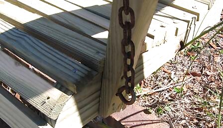Locate the position and height of your swing. Install eyebolts or eye-screws on a solid board for the overhead connection, and measure the length you will need your chains to hang your swing. You may find you need to adjust the chains to get the swing tilted back the proper amount to be comfortable for you.