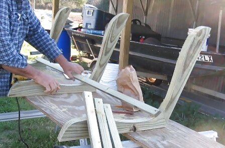 Make two armrest supports and armrests. Generally, the armrest should be about 8in (20cm) high and 18-20in (~.5 m) long. Make the armrest supports. Cut two wedge-shaped 2x4 in. (50x100 mm) boards about 13 inches (33 cm) long, tapered from 2 /4 inches (70mm) on one end to 3/4 inch (19mm) on the other. Make the actual armrests. Cut two more boards 22in (56cm) long, tapered on one end from 1 /2 inches (3.8cm) to full width in 10 inches (25.4cm) for each armrest itself. Attach the armrests. Locate the height you want the armrest on the back frame, then locate the position you want the support on the seat portion of the frame. Attach these with 3 in. (7.5 cm) #12 wood screws. Fasten through the top of the armrest down into the support board with two more wood screws.
