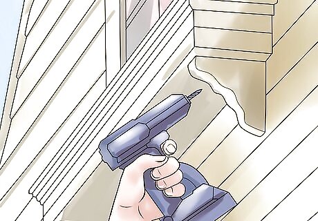 Install the window box. Drill holes into the exterior wall where you're going to hang your window box. Additionally, if you have left lumber to serve as a separate brace, drill holes for that as well. Attach the brace first, then the window box, screwing them in tightly but without damaging the wood. When screwing the window box to the brackets from the bottom of the window box, use screws that are slightly shorter than the thickness of the bottom of the window box. You also want to consider the type of siding that you're installing the window box over. In some cases (like with vinyl), you may want to remove the siding and install the window box in that now-empty space.