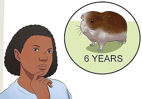 Understand the basics of guinea pig care. Before you purchase a guinea pig, familiarize yourself with the kind of care guinea pigs need. You want to make sure you have the time and money to truly commit to your pet before making a purchase. Guinea pigs are social animals, meaning they thrive when they have a cage mate. Many rescues will want you to adopt a pair together. Consider buying two guinea pigs to make sure your pet is not lonely. However, you should make sure that a male and female are never placed together, as guinea pigs are notorious for breeding. You should never intentionally breed, as it's risky and dangerous. Guinea pigs live to be about 7-10 years of age. Know how old your guinea pig is when you purchase them and how long you can expect them to live. You need to know you're able to commit to the guinea pig for that time frame. Make sure you have access to a vet with the necessary experience to treat your guinea pig. Guinea pigs are often considered exotic pets, meaning not all vets are willing to take them as patents. Find a good vet before buying a guinea pig. Many people purchase guinea pigs assuming they're more of an aesthetic commitment and that, much like fish, are content to roam around unattended. This is not the case. Guinea pigs need time out of their cage to run and explore and like to play with their humans. Your guinea pig will need attention and care each day. If you get a longhaired guinea pig, the commitment will be even greater, as daily grooming is necessary. If you have cats, reconsider getting a guinea pig. Cats will view your guinea pig as prey. If you have cats, make sure there's a space you can keep your guinea pig's cage that's out of their reach. However, never put a guinea pig cage outside. Guinea pigs do not tolerate the cold well.