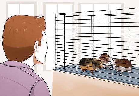 Make sure your chosen guinea pig is healthy. When looking at potential guinea pigs, know how to recognize good health. Healthy guinea pigs run around on all fours. Be wary of sluggish guinea pigs, especially those with flaky skin and bald patches. Guinea pigs should have smooth hair, steady breath, and their eyes and ears should be clear, bright, and free of discharge. Feel the guinea pig's body to make sure it's plump and free of any unusual lumps or swelling.