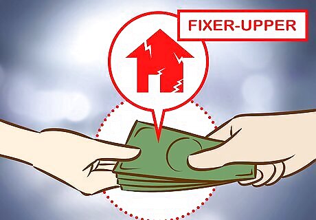 Buy a fixer-upper. Credit scores affect how much we can take out in loans, so aim for something at a low price with the intent of fixing it up over time. However, much like a subprime loan, this is only a good alternative option under certain conditions. Be honest with yourself. How much home repair are you able to do on your own? If you're particularly handy, and can undertake many repairs yourself, a fixer upper can be a bargain. But if you have to factor in costs of labor, which can get expensive fast, this might end up far more expensive up front than buying a pricier home. Know everything you can about the house. After your offer is accepted by the seller, an appraiser and inspector will evaluate the home and tell you what repairs may be necessary. Once you know what needs to be fixed, figure how much these repairs will cost and whether you can afford them. Aim to buy a house that's priced low because it needs certain cosmetic upgrades rather than a major overhaul. Look for fixer uppers in good neighborhoods, as you can get them up to market value with time and work. A house in a bad neighborhood will always be priced lower unless the neighborhood improves. Fixer-uppers may be more difficult to finance. Talk to a lender who will help you finance repairs after closing. While you may be able do the repairs yourself, it is usually best to get a licensed contractor to do them.