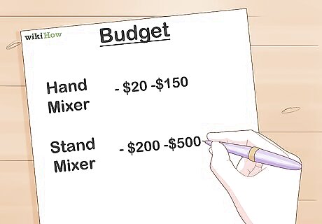 Establish a budget. The cost of mixers varies dramatically. You will need to budget for a mixer regardless of the type. You can buy a hand mixer at a discount store for as little as $20.00 and upwards of $150.00. A stand mixer will range from $200.00 to upwards of $500.00. If you are budget restricted you do not have to overspend to get a good mixer. If you are a beginner in the kitchen but love expensive appliances, you can have the look of a pro for the right budget. Make sure you set a budget and stick with it.