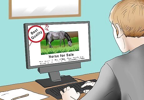 Search advertisements. If word of mouth doesn't yield any results, try the classifieds in local papers, equestrian magazines, or on the Internet. You may find the perfect trail horse through one of these avenues. Be cautious when buying a horse from someone you don't know personally. Assess their character, ask for references, and look at the conditions they are keeping their horses in. All of these factors, as well as the health and fitness of the horse they are trying to sell, will let you know whether or not to buy from them. Ask questions to make sure the person is reputable: “How long has the horse been in your possession?” “Has the horse been sick at all while under your care?” “Is the horse on any supplements or medications at the moment?” “What level of work has the horse been in and what is it doing now?"