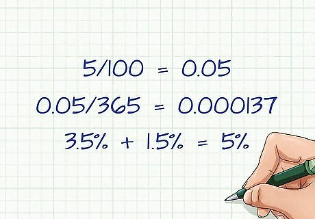 Find your daily interest rate. If listed as percentage (that is, 5 percent), start by changing it to a decimal by dividing by 100 (5/100 = 0.05). Remember that this is the annual interest rate. Divide by 365 to get the daily interest rate. In this case, that would be 0.05/365, or 0.000137. Your interest rate may be tied to a government-standard interest rate, such as the prime rate. If this is the case, your calculation of your interest rate is more complicated. You have to find out what the margin is on your interest rate (how much higher your rate is than the prime rate, for example) and add that to current prime rate. For example, imagine in this case that the prime rate is 3.5% and your margin is 1.5%. This sets your interest rate at 5%.