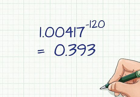Raise your monthly interest rate to the negative power of your monthly payment total. This sounds complicated but it is simple to do on a calculator. Enter your converted monthly interest rate (1.00417) in the example first. Then press the exponent key, which usually looks like this: x y {\displaystyle x^{y}} x^{y}. Next, enter the total number of monthly payments you will make (120 in the example) with a negative sign in front of it (so -120). Press enter to get your answer. In the example, this will be 1.00417^-120, or 0.607.
