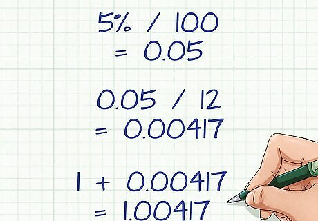 Convert your annual interest rate. First, divide your interest rate by 100 to get it in decimal form. In the example, this would be 5%/100, or 0.05. Next, divide your annual rate by 12 to get a monthly interest rate. This would be 0.05/12, or 0.00417. Finally, add 1 to your monthly interest rate. So, 1+0.00417=1.00417.