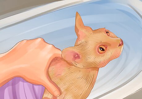 Consider bathing your cat regularly. The Devon rex has a thin coat that allows the cat's skin to get greasy, especially in folds of skin. If your cat is getting greasy, give it a bath. Fill your bathtub with a few inches of warm water, place the cat in it, and clean the cat with a mild soap made for cats. This should only need to be done every few weeks. After the bath, the cat can simply be towel dried and then allowed to finish drying on its own.