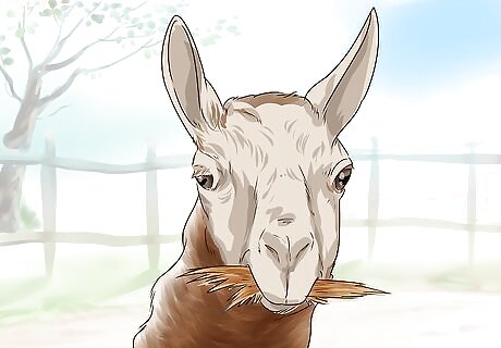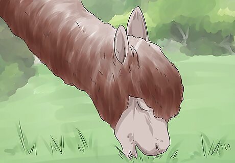 Feed your llamas grass hay. If you live somewhere that has poor quality pasture land or gets regular snow fall, you will want to feed your llama grass hay. Ideally, you should feed your animal orchard grass. You can also feed them alfalfa, but it should never constitute more than 20 percent of its diet. Too much alfalfa can cause a mineral imbalance. You should avoid feeding your llama straw, clover and timothy. Although it might be a little more costly in the short-term, good quality hay will keep your animal healthy and prevent expensive trips to the veterinarian.