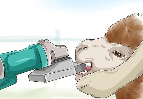 Trim your llama’s teeth if needed. Male llamas develop a set of sharp “fighting” teeth that they use against other males and intruders. You may choose to have your veterinarian remove these teeth to prevent any injury to other animals and yourself. However, if you keep your male away from other males, you may not need to remove the teeth. Be sure to talk with your veterinarian about removing your llama’s teeth.