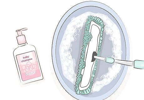 Use baby shampoo and water to wash laminate floors. Many commercial cleaners can leave laminate floors looking dull and streaky. Baby shampoo, however, is gentle and safe to use. Mix 1 tablespoon (15 ml) of baby shampoo with 1 gallon (3.8 l) of water. Dip a microfiber mop in the solution, wring out the excess water, then use it to scrub the floors. When you’re done, go over your floor with a dry cloth. Excessive moisture can warp the laminate, so don’t skip the drying step!