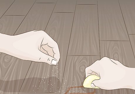 Get rid of rust stains with lemon and salt. Metal items can leave rust stains on your laminate floors. To remove them, sprinkle table salt (not coarse salt) over the area. Cut a lemon in half and rub 1 half over the salt. If the stain is especially stubborn, you can saturate the area in salt and lemon juice and let it sit overnight. Then, rub a new lemon half over the stain in the morning. Use a damp cloth or paper towel to pick up the salt and remove any remaining lemon juice.