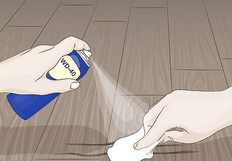 Remove scuff marks with WD-40. If there are scuff marks from shoes covering your laminate floor, don’t fret! It’s super easy to remove them. Just spray a small amount of WD-40 onto the scuff mark, then wipe it away with a cloth or paper towel. Clean the area with baby shampoo or a mixture of vinegar and water after removing the scuff mark so the spot isn’t slippery from the WD-40.