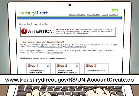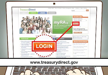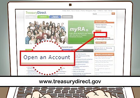 Create a TreasuryDirect account. If you don’t already have an account, you will have to create a new one. Go to the website www.treasurydirect.gov. On the right hand side in the orange “Account Login” area, click on the “open an account” link. On the next page, select TreasuryDirect, which is the first option under Individual/Personal accounts. Follow the three steps to create your account. Select the kind of account you are opening (i.e. individual or entity). Provide your personal information, including you Social Security number, email address and your bank account and routing number. Create your security features. Choose your password and password reminder, choose your personalized image and caption and create your security questions.