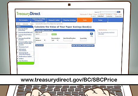Find out the value of the bond. Visit the savings bond value calculator of the US Treasury Department at www.treasury.gov/BC/SBCPrice. Enter all of the requested information about your bond, and it will tell you how much the bond is worth today. You can enter multiple bonds and create an inventory of bonds. Enter today’s date in the “Value as of” field. To find the value of the bond in past or future months, enter the desired date in this field instead of today’s date. In the “Series” field, select the type of bond you have. Paper bonds are either E Bonds, EE Bonds, I Bonds or Savings Notes. This information can be found in the top right corner of the bond. Select the denomination in the “Denomination” field. This can be found in the top left corner of the bond. Enter the bond’s serial number. It is located in the bottom right corner of the bond. Enter the issue date. This is located in the top right corner, under the Series. Click “Calculate” to learn the value of the bond as of today. To build an inventory of bonds, continue adding information for multiple bonds in the same fashion. The calculator will keep track of all your bonds, displaying the last one entered at the top of the list. Use your browser’s built in saving function to save your inventory. Click “view/print/save list.” When the list appears, click “file/save as,” name your inventory and save it as an HTML file. Use the inventory to update your bond values quickly and easily.
