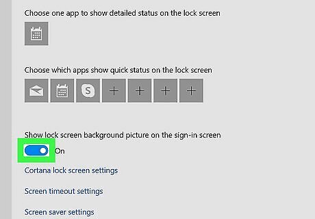 Slide the "Show lock screen background picture on the sign-in screen" switch to On Windows Switch On. You may have to scroll down to see this option. This ensures that the image(s) you selected will show not only on the lock screen, but also when you log in. If you want to change your account photo, which appears on the lock screen, you can do so in Settings by clicking Accounts and then choosing an option under "Create your picture."