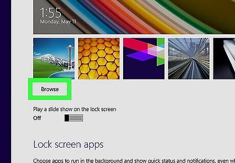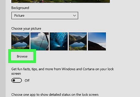 Click Browse. You should see this option below the row of demonstration photos in the middle of the page. You can also click on one of the demo photos to set it as your PC's lock screen.
