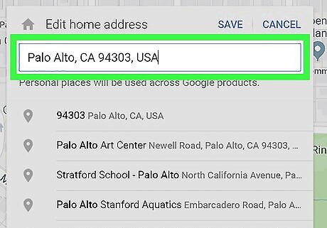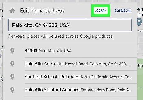 Click the SAVE button. It's located next to CANCEL in the upper-right corner of the search bar. This will save your new home address on your Google account.