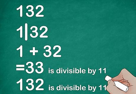 Check whether the answer is divisible by 11. If it is, then the original number is divisible by 11 as well. If your answer is not divisible by 11, your original number is not either. If you're not sure whether the answer is divisible by 11, repeat these same steps to test it: Divide 132 into 1 | 32. Add these together to get 1 + 32 = 33. Since 33 is divisible by 11, then 132 is as well. Since 132 is divisible by 11, your original number 17952 is also divisible by 11.