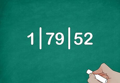 Divide the digits in pairs from right to left. Draw a vertical line to separate the two rightmost digits from the rest of the number. Move left two more spaces and draw another line. Repeat until the whole number is divided into pairs of digits. (The last digit on the left might be alone.) For 17952, start at the right (the ones place) and count two digits to the left, then draw a line: 179 | 52. Count left two more digits and draw another line: 1 | 79 | 52.