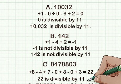 Solve example problems. Here are a couple practice problems. Try to solve them on your own, then check the answers below.Use the alternate sums method on each number to check whether it's divisible by 11:A. 10,032B. 142C. 8,470,803