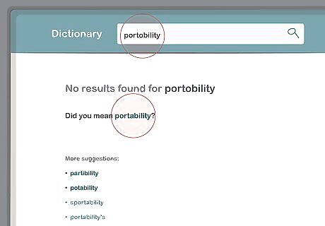Keep an online or print dictionary handy if you’re writing a paper. As is the case with a search engine, type in the word you want to look up in an online dictionary's search bar. Have a dictionary open in a tab on your browser for quick reference if you'll need to look up words frequently. For easy access on the go, you could also download a dictionary app for your phone. Even if you misspell the word, the search results will include the nearest matches. To ensure you’ve chosen the right match, click on the word and double check its meaning. For instance, say you want to find out how to spell “portability.” If you take a guess at the spelling and search for “portability,” you’ll see “potability” and “partibility” among the results. Without checking the definitions, you could accidentally use one of these words instead of “portability.”Keep in mind: If you're using a print dictionary, words with silent first letters can be tricky to find in an alphabetical listing. The most common silent letters combinations in English are “kn-” (as in “knuckle”) and “wr-” (as in “wrestle”). Additionally, if you have trouble finding a word that starts with an “f” sound, check under “ph” (as in “phantom”).