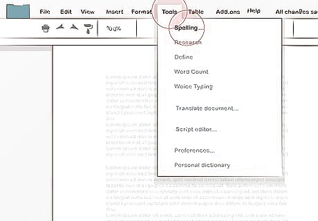 Find the spell check under “Tools” in Google office programs. To run the spell checker in Google Docs, Sheets, Slides, and Forms, click on “Tools” on the menu bar. Hover the cursor over “Spelling,” then select“Spell check.” You can also find the spell checker in the “Tools” menu for WordPerfect and LibreOffice.
