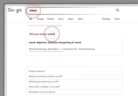 Search online for a word's proper spelling. If you need to learn the right way to spell a word, run a quick online search. Type in your best guess, then check the search results for the right spelling. Even if you misspell the word, the search engine will still turn up useful results. To ensure you get the right spelling, look for a reliable source in the search results, such as an online dictionary. The search engine might generate a suggested search term as you type the word. To stay on the safe side, complete the search and look for a dictionary entry in the results. Don’t just go with the suggested search term, as it could be misspelled.