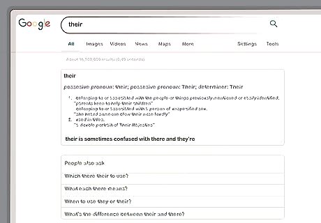 Watch out for tricky homophones, like “their” and “there.” Don’t rely on solely on spell checkers, as they usually can’t catch mixed up homophones. Check your work carefully and make sure you’ve used “there,” “their,” and “they’re” or “two,” “to,” and “too” correctly. If you have trouble keeping homophones straight, try using little memory tricks to remember which word is which. For example, to distinguish “piece” and “peace,” notice that the word “pie” is part of “piece.” Remember that you want a “piece” of pie, and that a “peace” of pie is incorrect. If you're worried about mixing up words that sound the same, search for them online. For instance, search for “their” and “there,” then find examples of correct usages in the results.