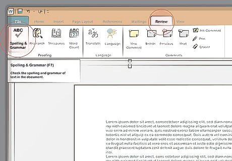 Access the spell checker under the “Review” tab in Microsoft Office. In most Office programs for PC and Mac, including Word and PowerPoint, click on the “Review” tab to run a full spell check. Look for a button labeled “Spelling” or “Spelling and Grammar” on the left side of the screen. Click on it to search your entire document for spelling and grammatical mistakes. To check your spelling as you type, run the spell checker and find the “Options” button at the lower left corner of the dialog box. Then check the box for “Check spelling as you type.” In versions of Microsoft Office prior to 2004, note that spelling and grammar is located under the “Tools” drop-down menu.Quick tip: In the PC version of Microsoft Office, press the F7 key to instantly run the spell checker.