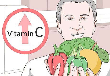 Increase your intake of vitamin C. Eating foods with a high vitamin C content, like citrus fruit, will help your body absorb more iron. Thus, this is recommended both if you're following an iron-rich diet or taking supplements. You can get more vitamin C through: Oranges and orange juice Red and green peppers Strawberries and blackcurrants Broccoli and brussels sprouts Potatoes