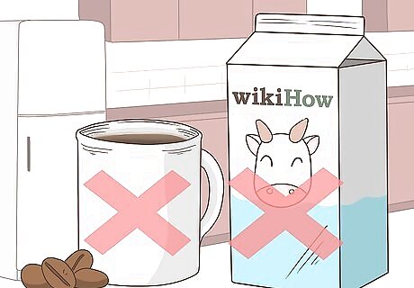 Carefully time eating foods that will hinder iron absorption. Combining iron supplements with some foods will make it harder for your body to absorb it. The following foods or supplements should be consumed no more than two hours after taking an iron supplement if you want to maximize your iron intake: Caffeinated drinks and food (coffee, black tea, chocolate) Calcium and antacid supplements Cow's milk (for children and infants)