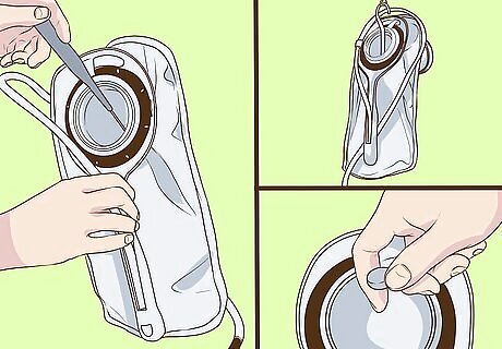 Clean your bladder. Depending on the model, you might be able to get a brush inside the bladder and scrub away with warm water. This is especially important if you’ve used electrolyte/sugar mixes in your pack. If you have an unusually-shaped bladder – like some of the vest-shaped hydration packs – cleaning the interior completely with a brush is impossible. Instead, you’ll have to swish some mixture of hot water and an antibacterial powder additive around inside, then rinse thoroughly several times with warm water. When you’re done cleaning the interior of the bladder, open it up as best you can and hang it upside down for several hours so that all excess liquid drains out. Always consult manufacturer directions for cleaning in order to clean your pack in the optimal way. Never use bleach or boiling water to clean the reservoir. Clean the bladder every time you use it if you’re putting sweetened drink mixes into the bladder. If you’re using only water in the bladder, you can get away with cleaning it once a week or even less.