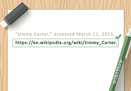 Add a direct URL and your date of access for works accessed online. A direct URL allows your readers to go directly to your source and read it themselves. Since things found online can move around or disappear, the date you accessed it can help a reader find an archived copy if it is later removed. For MLA citations, you don't have to include the "http://" portion of the URL, just the part that begins after the slashes. Typically this starts with a "www."