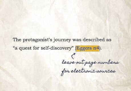 Leave out page numbers for electronic sources. If you're citing an online source that includes numbered footnotes (or more probably, numbered endnotes), you won't have a page number. You ordinarily wouldn't have a parenthetical citation for these sources, but you should point your reader to the footnote you quoted or paraphrased. For example: "(Eggers n4)."