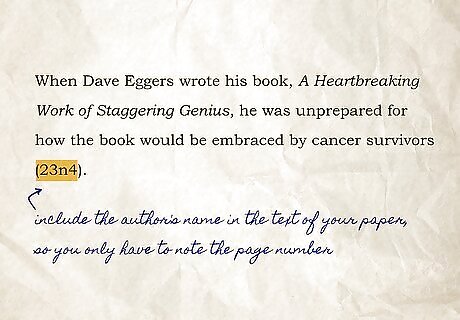 Build references into your text where possible. Parenthetical citations can disrupt the flow and readability of your text. For this reason, the MLA style guide encourages writers to include the author's name in the text of your paper itself, so you only have to note the page number where the information is found. For example: "When Dave Eggers wrote his book, A Heartbreaking Work of Staggering Genius, he was unprepared for how the book would be embraced by cancer survivors (23n4)."