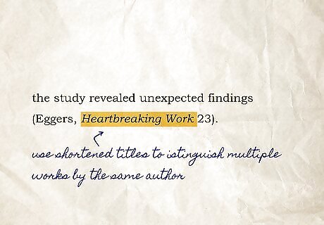 Distinguish multiple works by the same author with shortened titles. In some papers, you'll want to discuss several books or articles written by the same author. Include 1 to 3 words from the title so your readers know which specific work you're talking about. Your shortened title typically will be made up of the first couple of words in the title, excluding any initial articles such as "a" or "the." Put article titles in quotation marks and book titles in italics. For example: "(Eggers, Heartbreaking Work 23)."