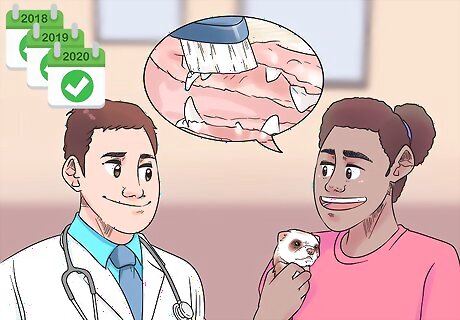 Get your ferret's teeth professional cleaned regularly. Since dental issues can cause pain, difficulty eating, and other health issues, vets recommend annual cleanings for ferrets. A deep cleaning involves anesthesia, as the vet will need access to the entire mouth. They'll use special tools to remove tartar deposits and, if necessary, to repair broken teeth. Annual dental cleanings are especially important for ferrets over three years old.