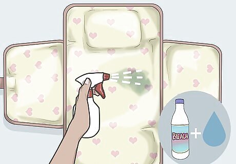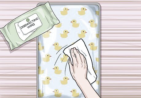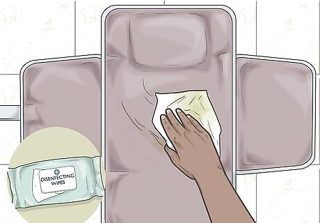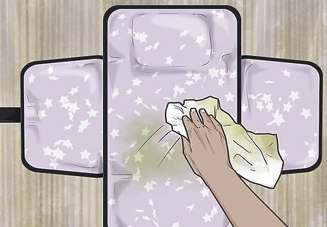Clean up any visible excrement with a paper towel. Before sanitizing the changing pad, check for any fecal residue along the surface. Do your best to blot and wipe up any visible stool and urine so the pad can be as clean as possible. If the item is soaked with urine, check the care label for the proper washing instructions. It’s easiest to clean your pad on a flat surface. To keep your pad as clean as possible, consider sanitizing it after each use.Did you know? Most travel changing pads are made with water-resistant material like canvas, rayon and polyester, which help make the initial cleaning process a lot easier.