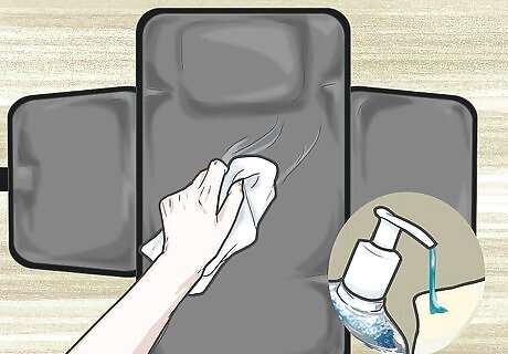 Wipe down the surface with soap and water if you don’t want to use harsh chemicals. Pour a pea-sized amount of mild detergent onto a paper towel or cloth, then rub down the surface of the travel changing pad. Focus on the areas where your baby sits, so the pad is completely sanitized for the next diaper change. Always check the care label before using any kind of detergent or soap on your pad.